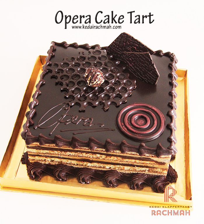 Opera Cake Kedai Rachmah yang sebagaian bersar berbahan dasar Chocolate dan dengan bentuk kotak 20 cm x 20 cm, siap anda pesan kapan saja