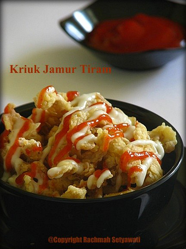 7. Panaskan api hingga sedang saja, jangan terlalu panas, goreng jamur bertepung hingga kering sempurna, angkat tiriskan, siap disajikan dengan aneka topping/taburan.